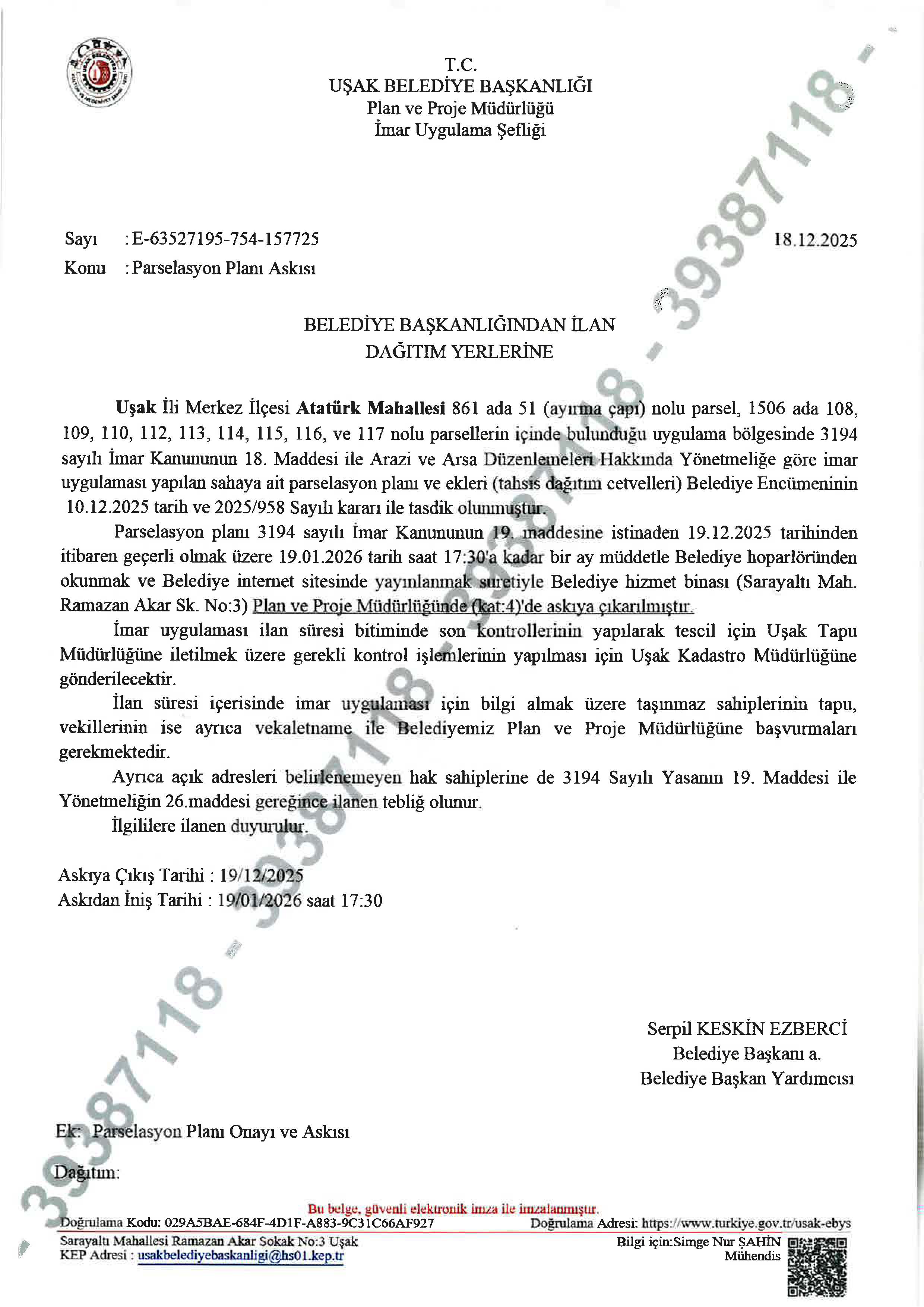 Parselasyon planı 3194 sayılı İmar Kanununun 19. maddesine istinaden 19.12.2025 tarihinden itibaren geçerli olmak üzere 19.01.2026 tarih saat 17:30'a kadar bir ay müddetle Belediye hoparlöründen okunmak ve Belediye internet sitesinde yayınlanmak suretiyle Belediye hizmet binası (Sarayaltı Mah. Ramazan Akar Sk. No:3) Plan ve Proje Müdürlüğünde (kat:4)'de askıya çıkarılmıştır.