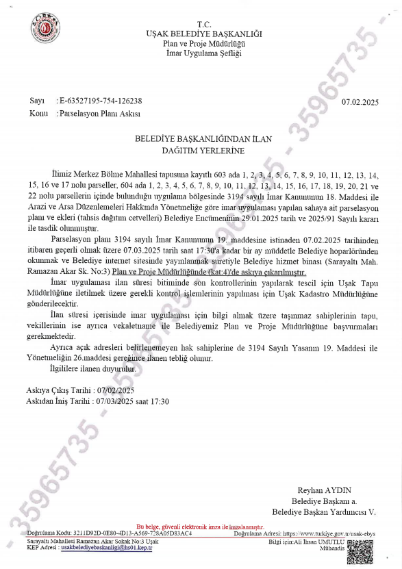 Bölme Mahallesi 603 ve 604 Adalar Muhtelif Parsellerde 3194 Sayılı İmar Kanununun 18. Madde Uygulama 2. askıya çıkmıştır. 07 Şubat 2025, 14:20