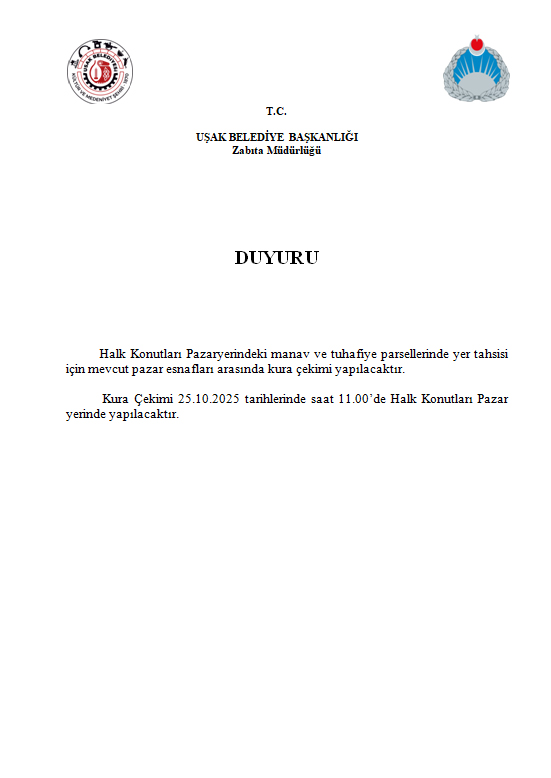 Kura Çekimi 25.10.2025 tarihlerinde saat 11.00’de Halk Konutları Pazar yerinde yapılacaktır.
