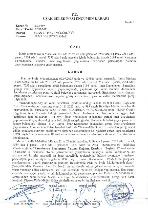Kalfa Mahallesi 140, 7550, 7553, 7554, 7555 adalar muhtelif parsellerde 3194 Sayılı İmar Kanununun 18. Madde Uygulaması Yapılmaktadır. Uşak Belediyesi A Blok Kat 4 Plan ve Proje Müdürlüğü İmar Uygulama Şefliğinden bilgi alabilirsiniz.