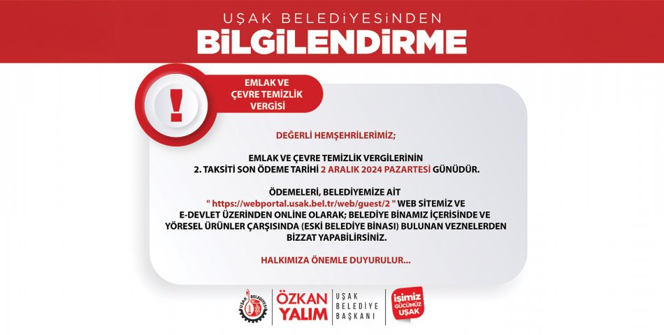 Emlak Ve Çevre Temizlik Vergileri 2. Taksiti Son Ödeme Tarihi 2 Aralık 2024 Pazartesi Günüdür.