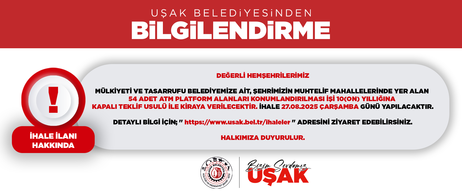 MÜLKİYETİ VE TASARRUFU BELEDİYEMİZE AİT, ŞEHRİMİZİN MUHTELİF MAHALLELERİNDE YER ALAN 54 ADET ATM PLATFORM ALANLARI KONUMLANDIRILMASI İŞİ 10(ON) YILLIĞINA KAPALI TEKLİF USULÜ İLE KİRAYA VERİLECEKTİR. İHALE 27.08.2025 ÇARŞAMBA GÜNÜ YAPILACAKTIR.