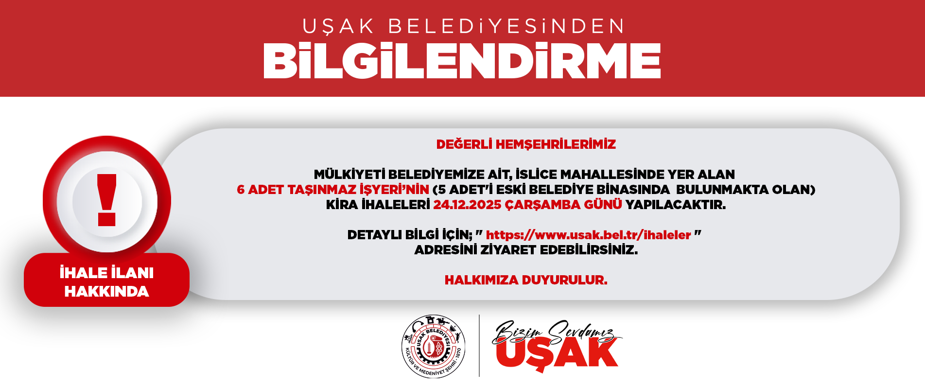 DETAYLI BİLGİ İÇİN; '' https://www.usak.bel.tr/ihaleler '' ADRESİNİ ZİYARET EDEBİLİRSİNİZ.