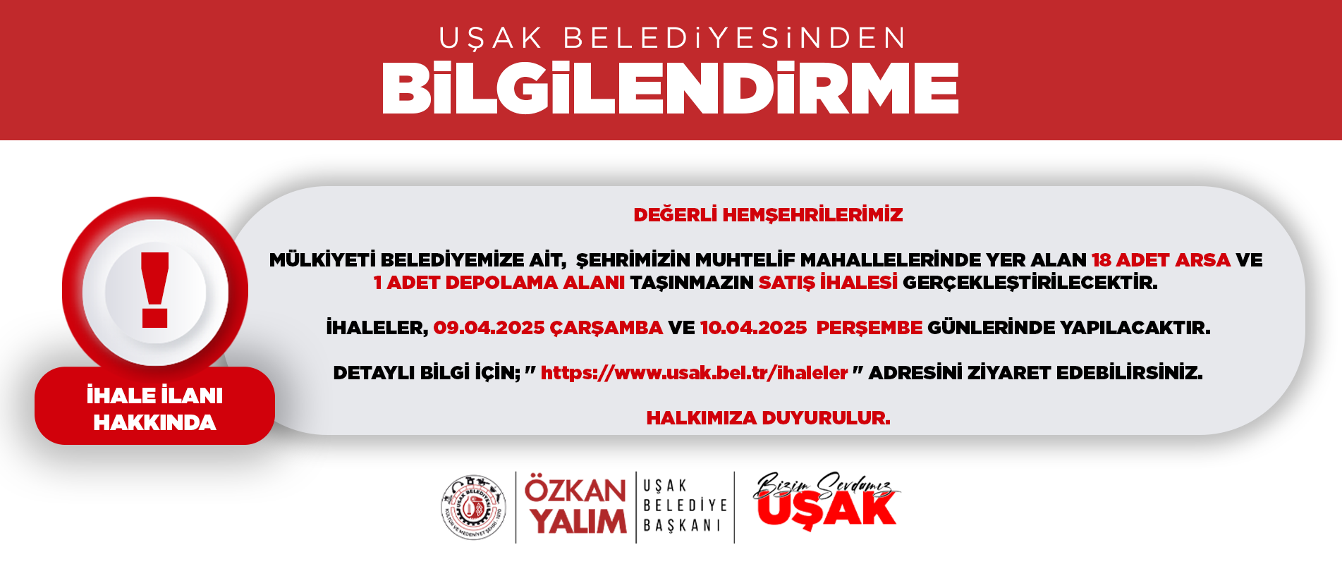 DETAYLI BİLGİ İÇİN; '' https://www.usak.bel.tr/ihaleler '' ADRESİNİ ZİYARET EDEBİLİRSİNİZ.