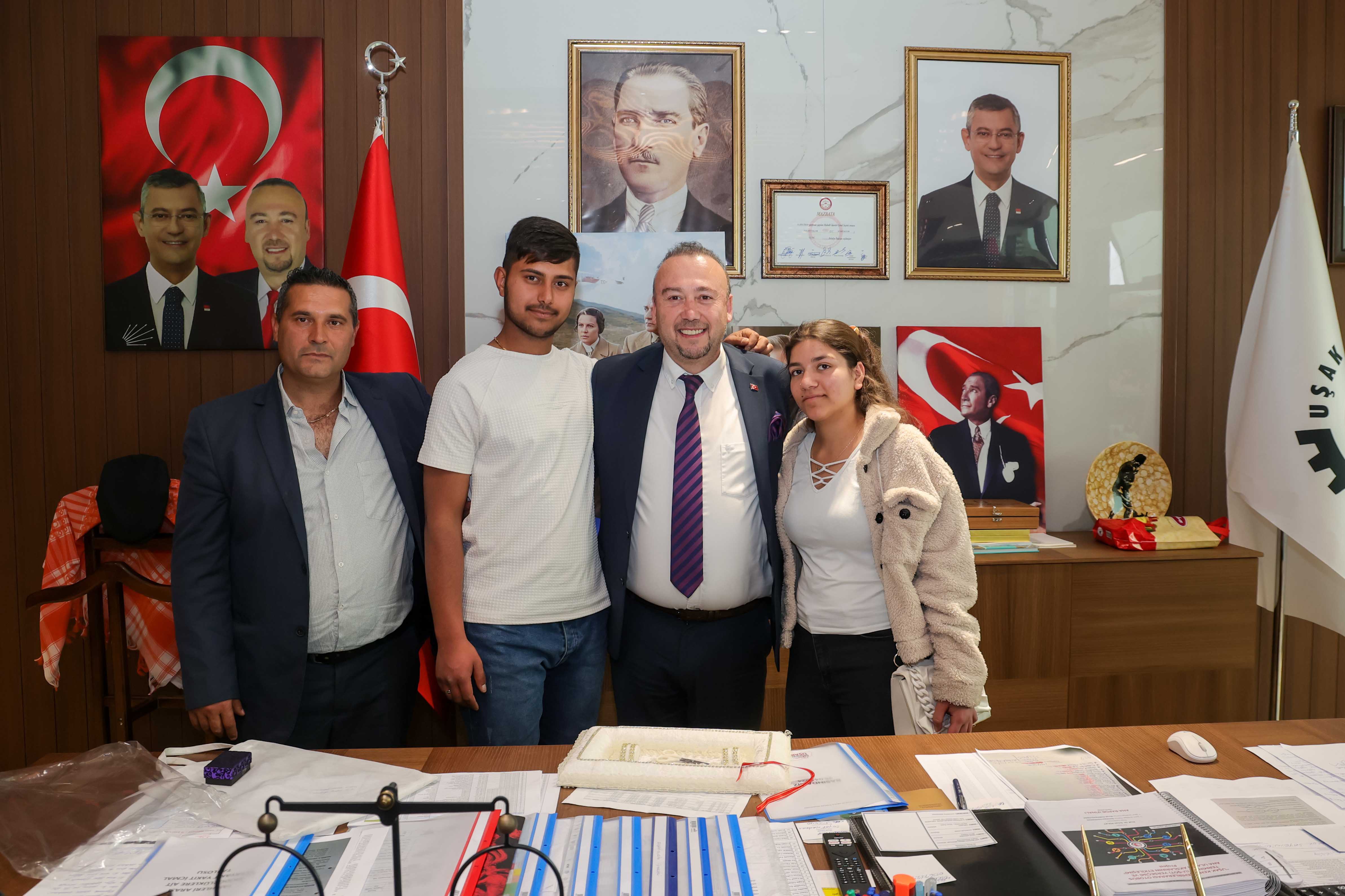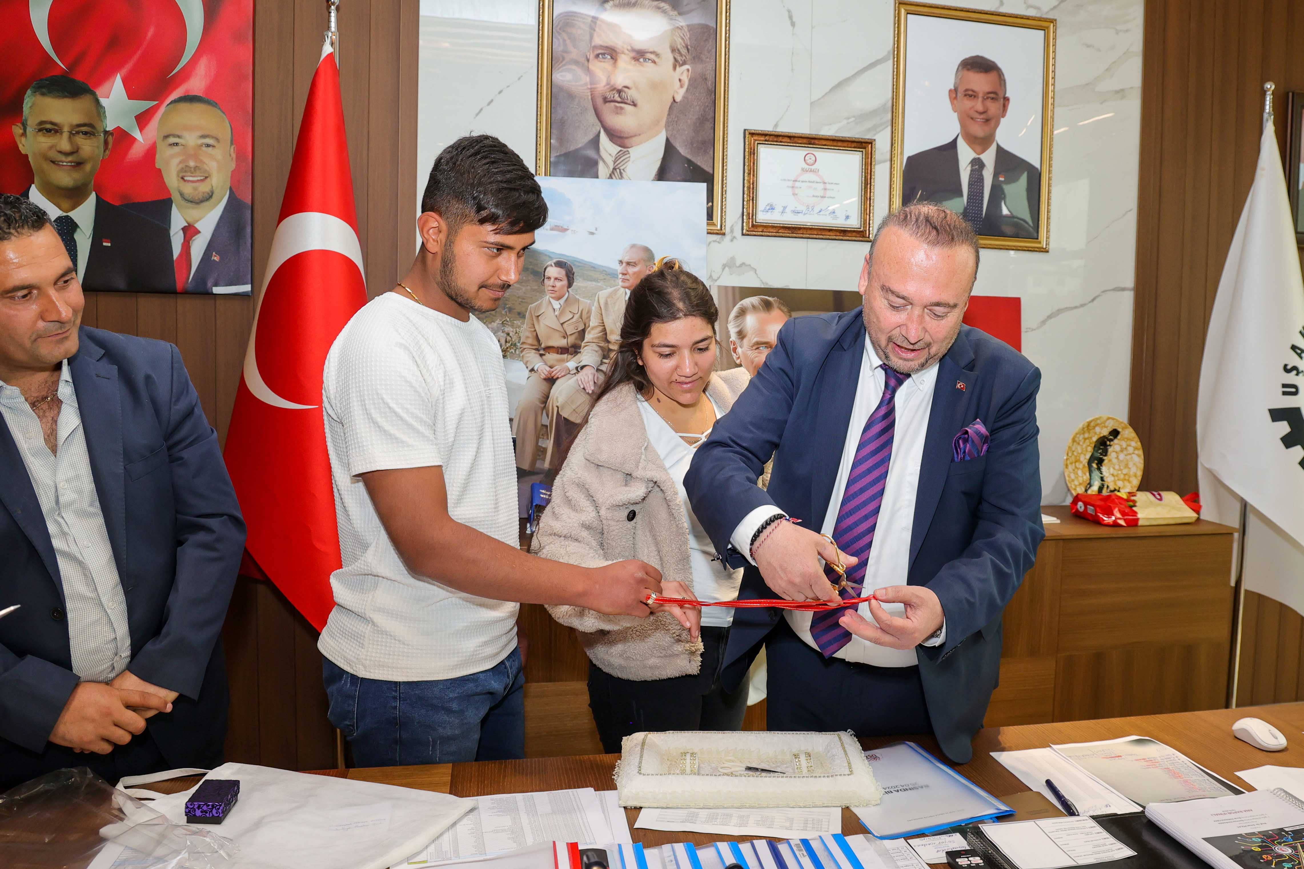 Başkanlık koltuğuna oturduğu günden bu yana Uşak halkının büyük ilgisi ve sevgisiyle karşılaşan Uşak Belediye Başkanı Özkan Yalım; halk gününde kendisini ziyarete gelen genç çifti kırmayarak nişan yüzüklerini taktı. Neşeli anların yaşandığı makam odasında gerçekleşen nişan töreninde Başkan Yalım genç çifte mutluluklar dileyerek onları tebrik etti.
