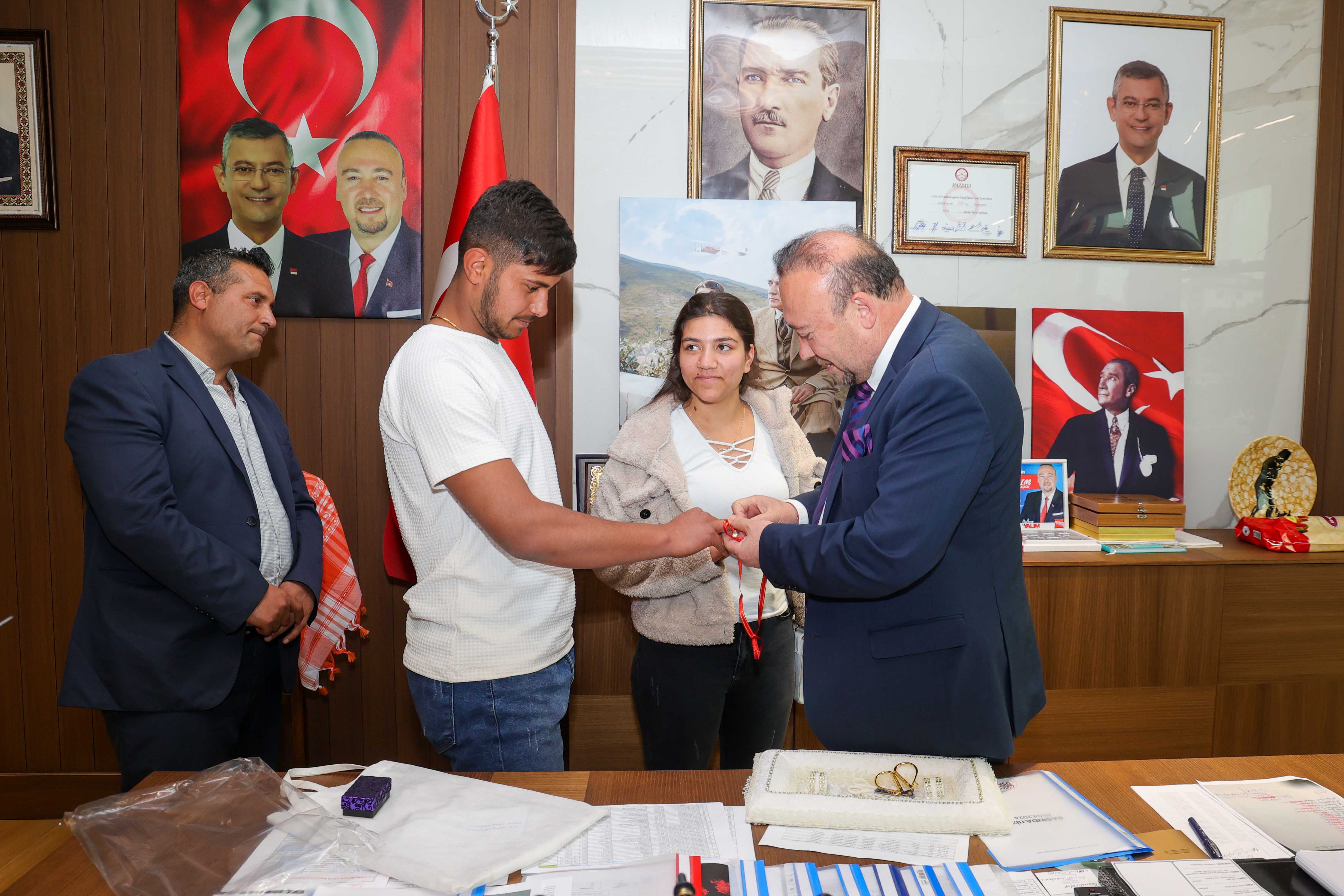 Her hafta Perşembe günleri makam odasının kapısını açan ve vatandaşları makamında ağırlayan Başkan Yalım; akşamüstü kendisini ziyarete gelen Sude Coşkun ve Nurettin Sağdemir çiftinin en mutlu günlerinden birine şahitlik etti. Başkan Yalım’ı Mayıs ayında yapılacak düğün törenlerine davet eden genç çift, aynı zamanda nişan yüzüklerinin Başkan Yalım tarafından takılmasından mutluluk duyacaklarını söyledi. Bunun üzerine onları kırmayan ve mutluluklarına ortak olmaktan zevk duyacağını ifade eden Başkan Yalım, çiftin yanlarında getirdikleri nişan yüzüklerini parmaklarına takarak kurdelelerini kesti.