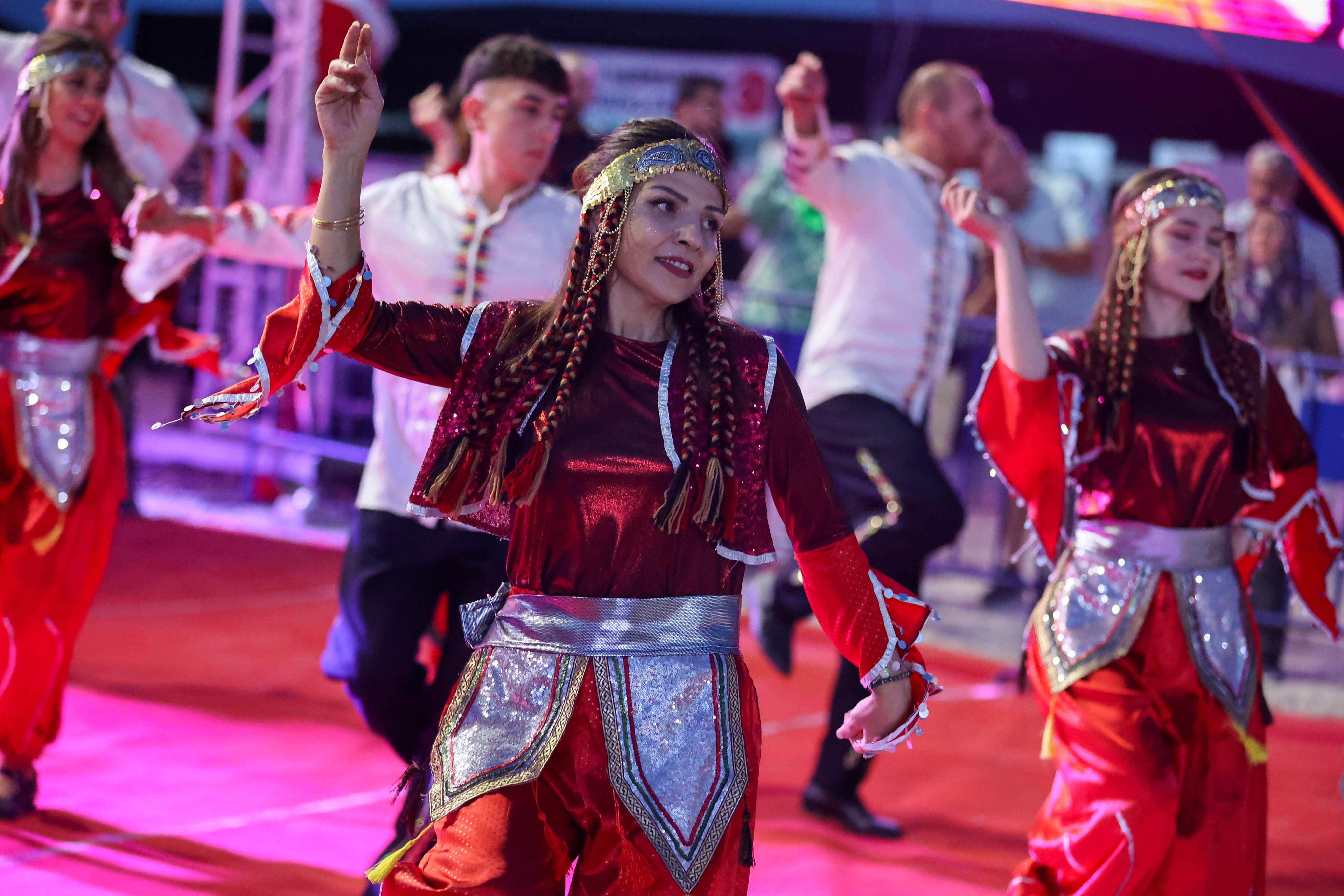 Ardından sahneyi görsel zenginlikleriyle dolduran Uşak Ayna Halk Oyunları Grubu; yöresel dansları ile sahnenin tozunu attırarak festival severlere adeta bir görsel bir şölen izletti.
