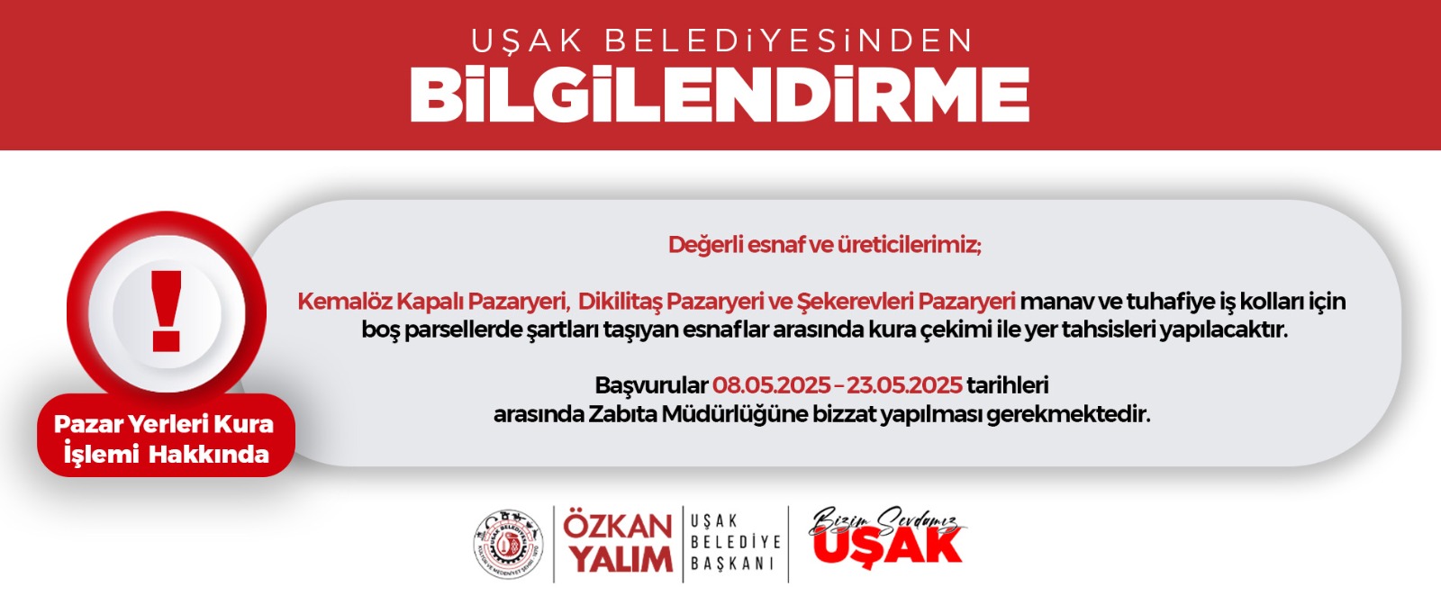 Başvurular 08.05.2025 – 23.05.2025 tarihleri arasında Zabıta Müdürlüğüne bizzat yapılması gerekmektedir.