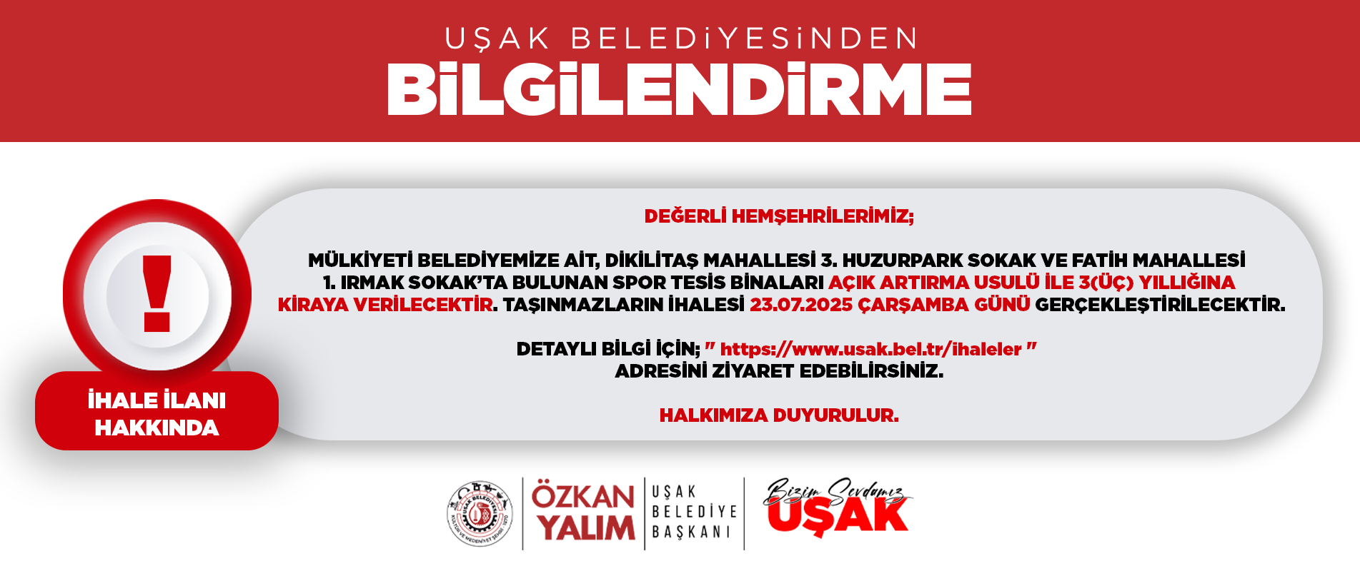 DETAYLI BİLGİ İÇİN; '' https://www.usak.bel.tr/ihaleler '' ADRESİNİ ZİYARET EDEBİLİRSİNİZ.