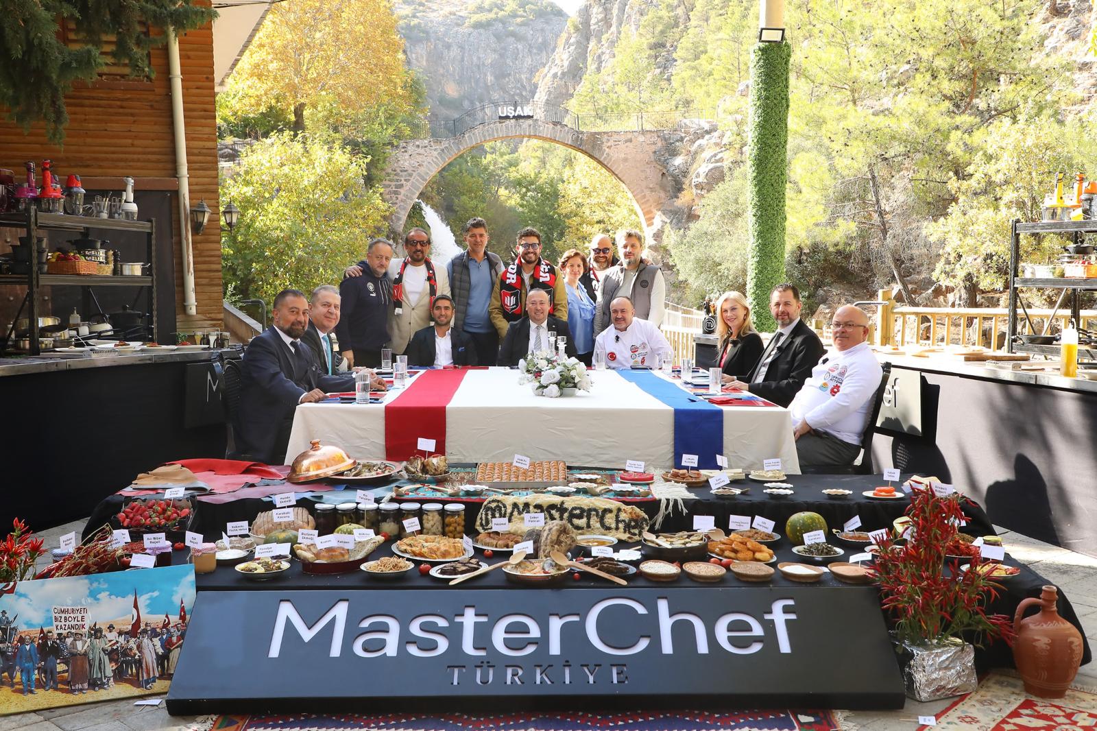 Uşak Belediye Başkanı Özkan Yalım’ın girişimleriyle gerçekleşen çekimlerde yarışmacıların pişirdiği yemeklerin haricinde Uşak ve çevresine ait 65 çeşit geleneksel yemek sergilendi ve şeflere tattırıldı.