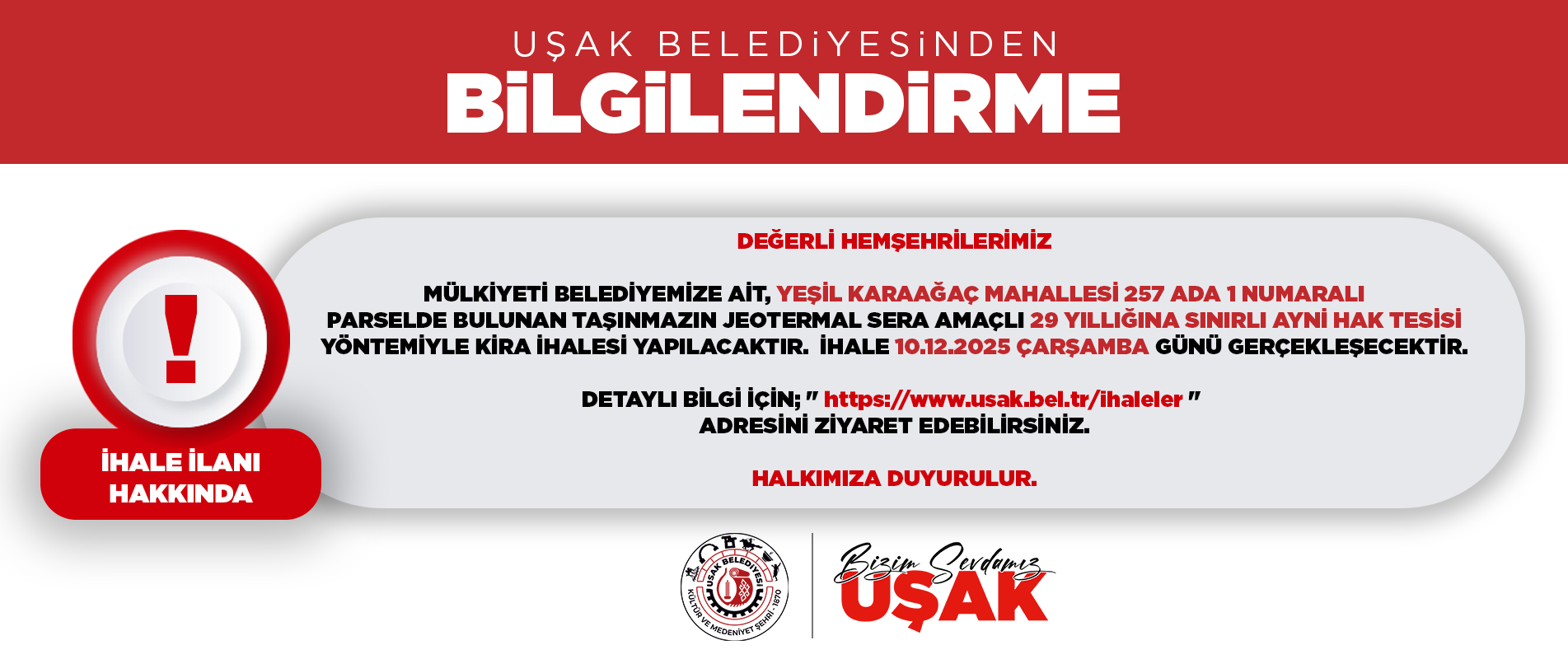DETAYLI BİLGİ İÇİN; '' https://www.usak.bel.tr/ihaleler '' ADRESİNİ ZİYARET EDEBİLİRSİNİZ.